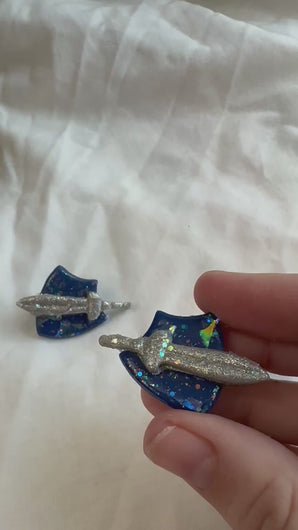 Polymer clay navy blue shield and silver sword pin. Sparkling accent