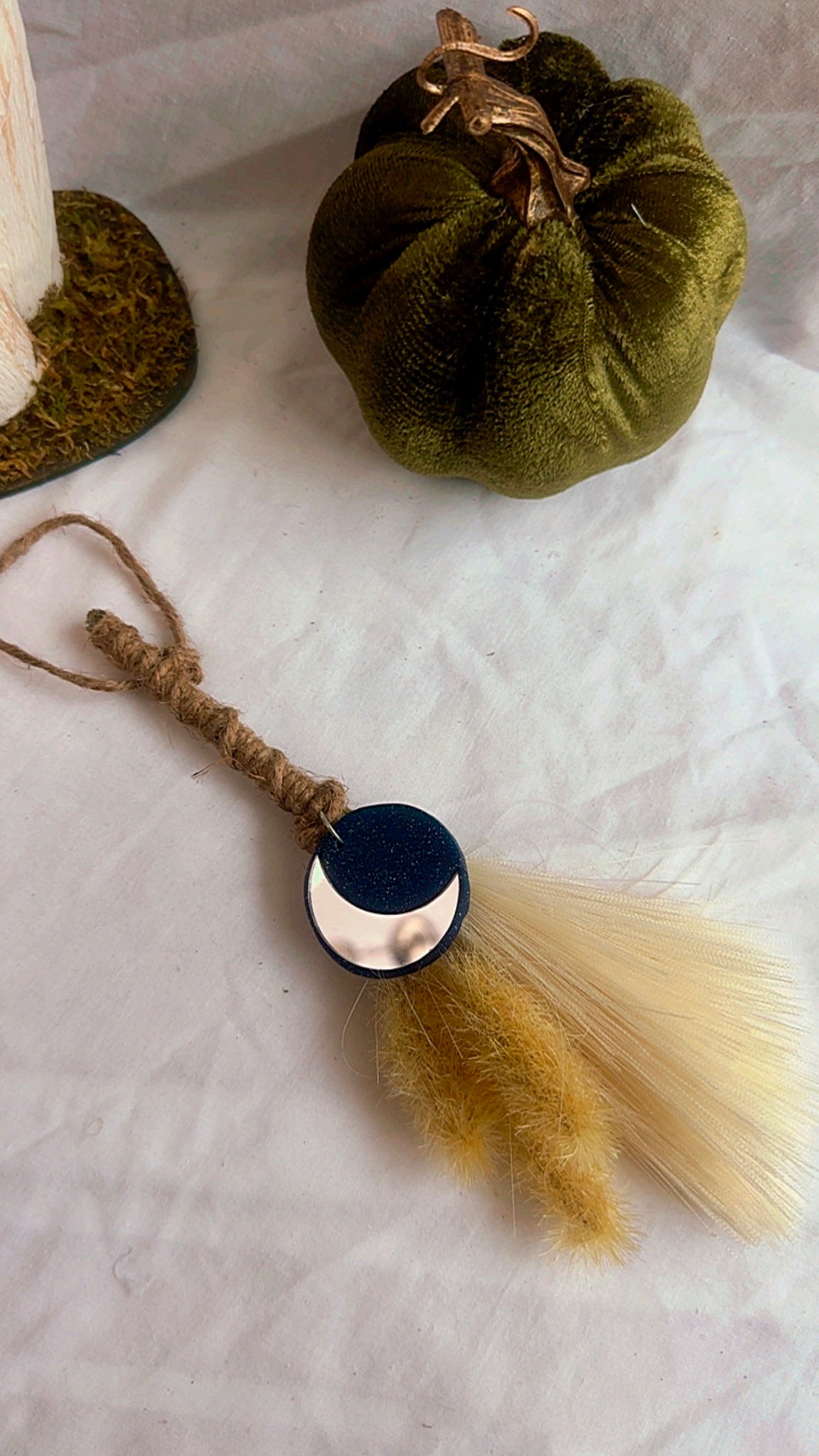 Small decorative mini broom with the option for wall hanging. Fall themed and includes a polymer clay moon mirror charm