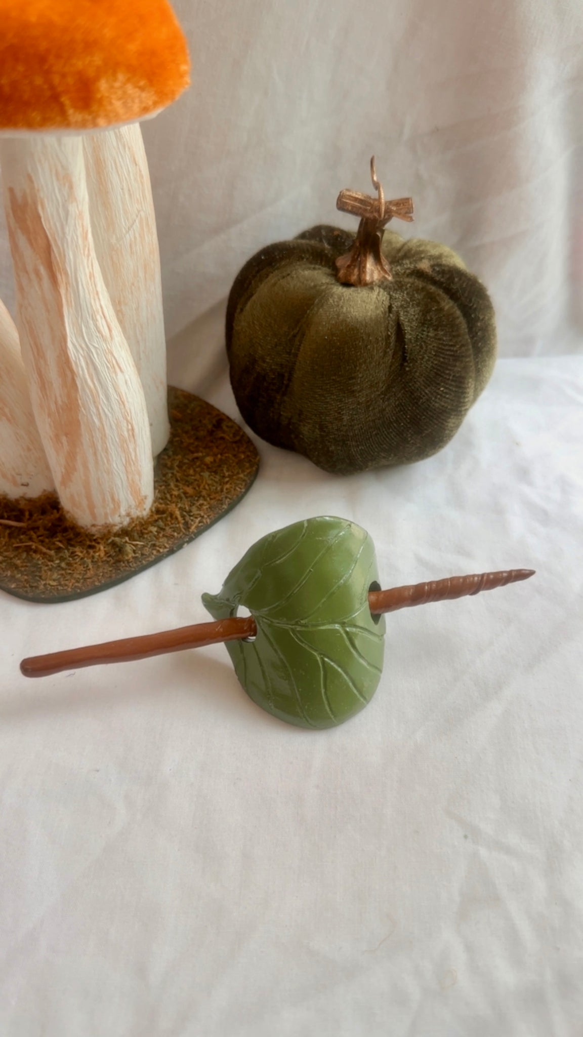 Polymer clay green leaf with polymer clay wood design stick hair barrette