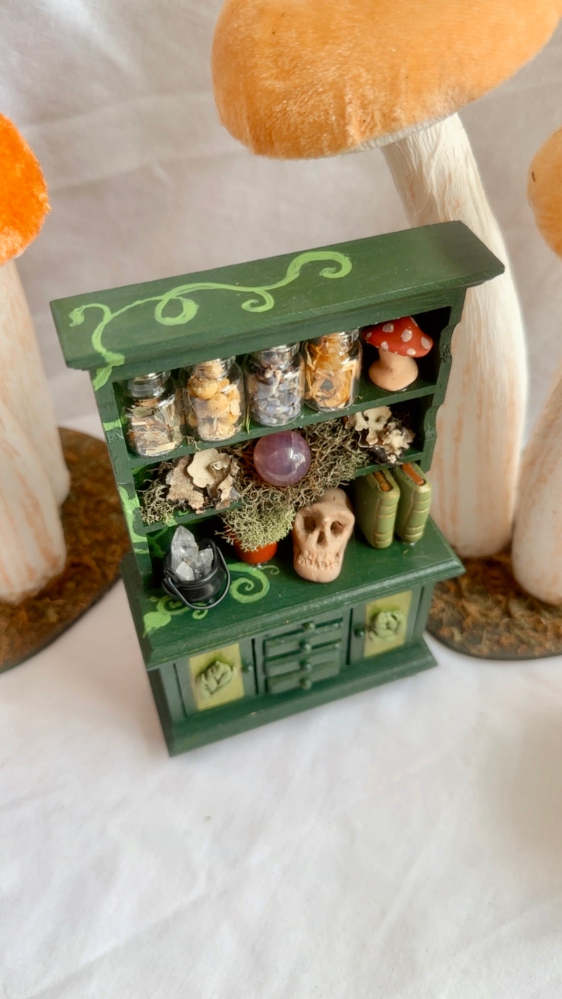 Miniature curio cabinet decorated with polymer clay fall themed items and spooky goods