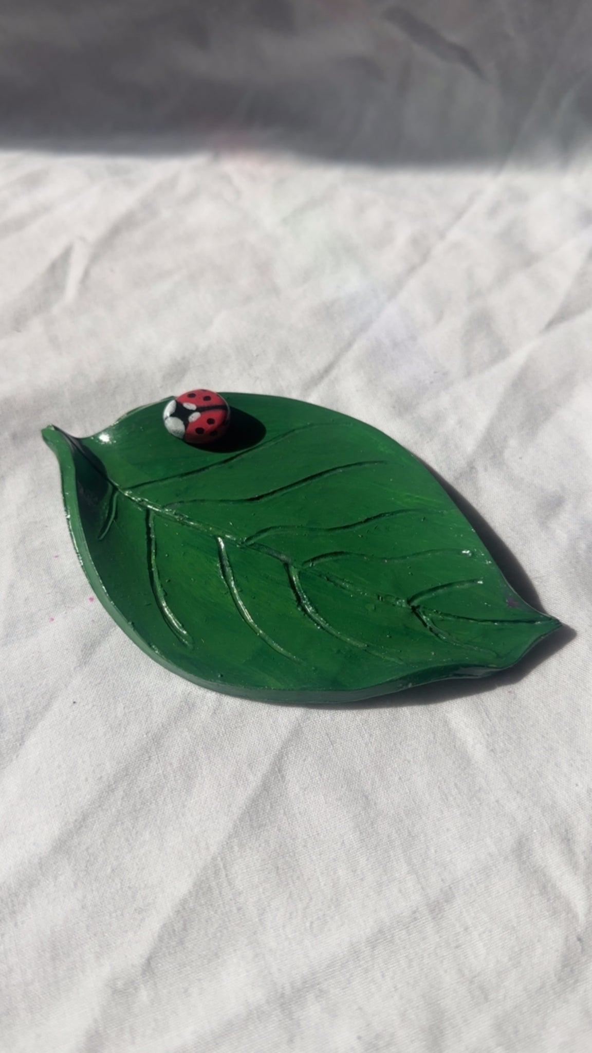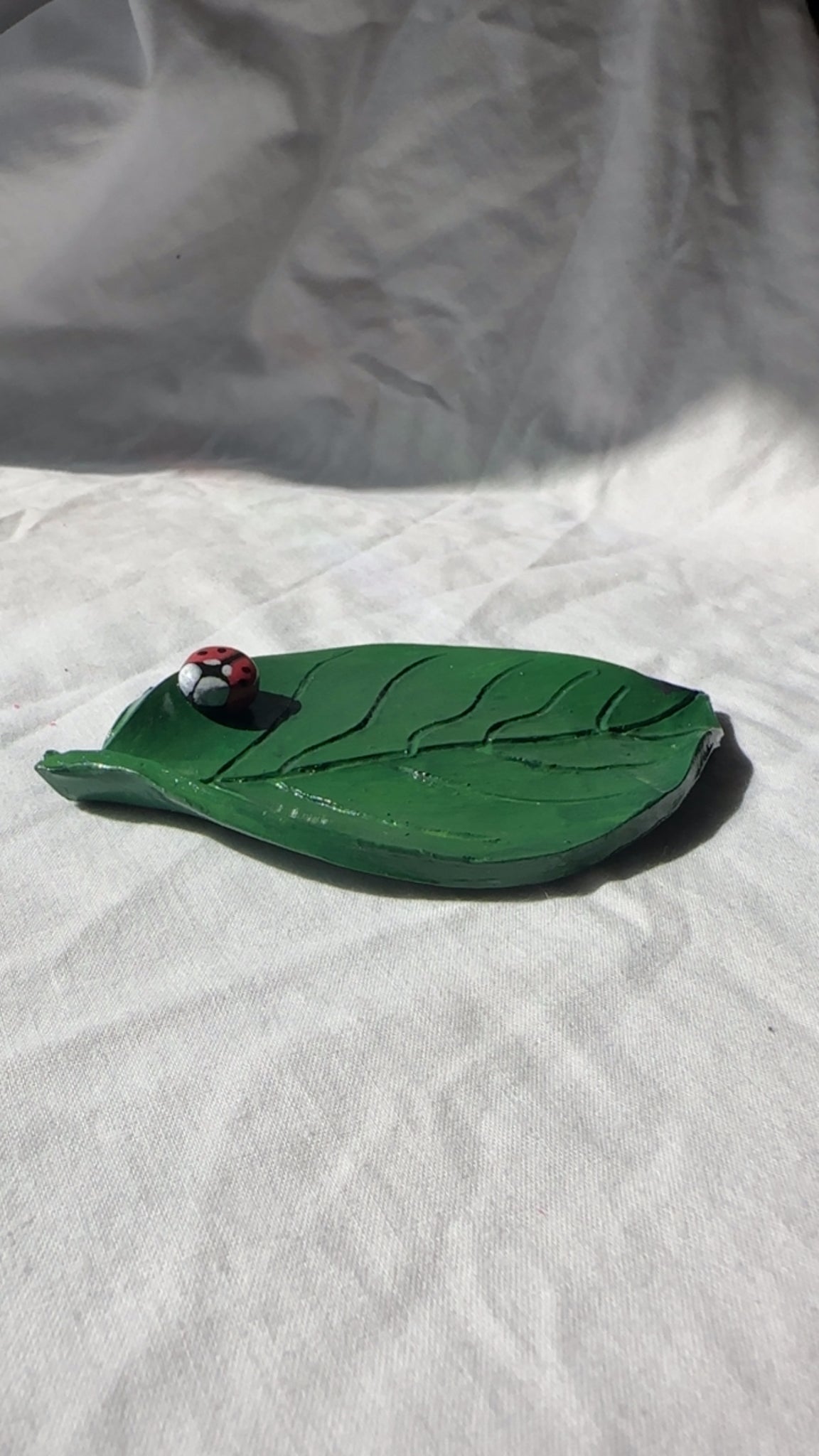 Polymer clay dark green ladybug leaf trinket dish/ jewelry holder