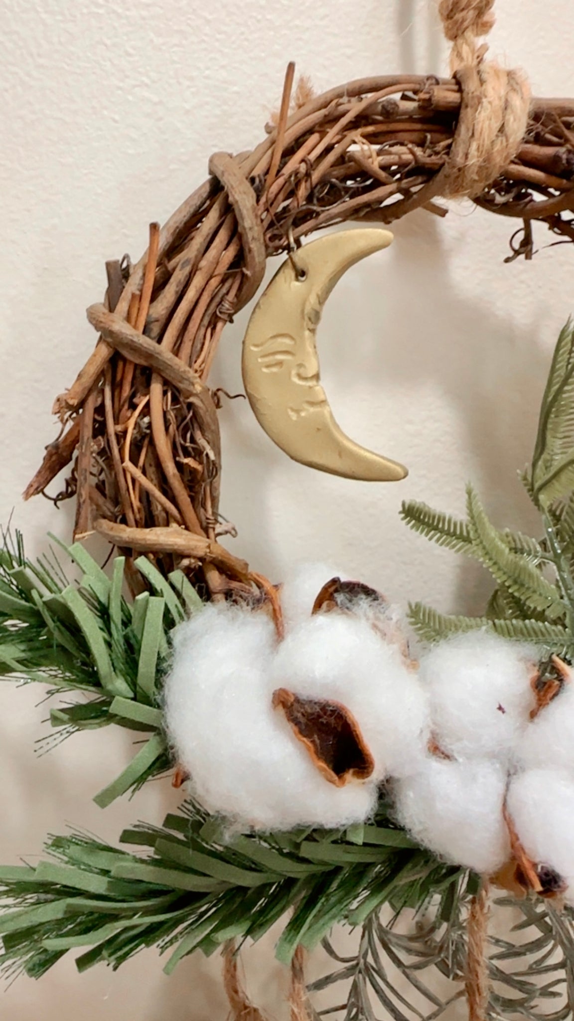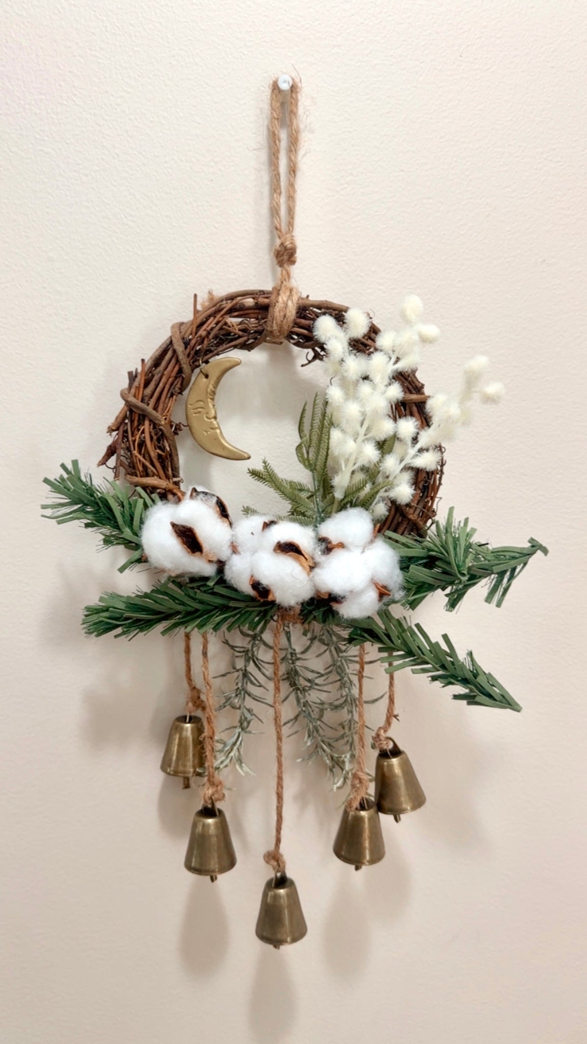 Winter inspired hanging small wood branch wreath embellished with foliage,5 bells and a polymer clay moon
