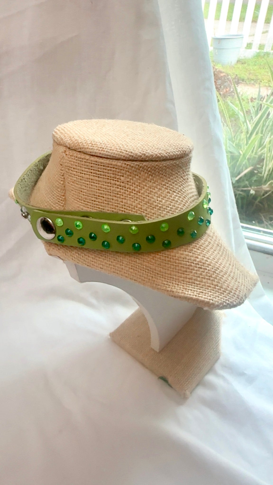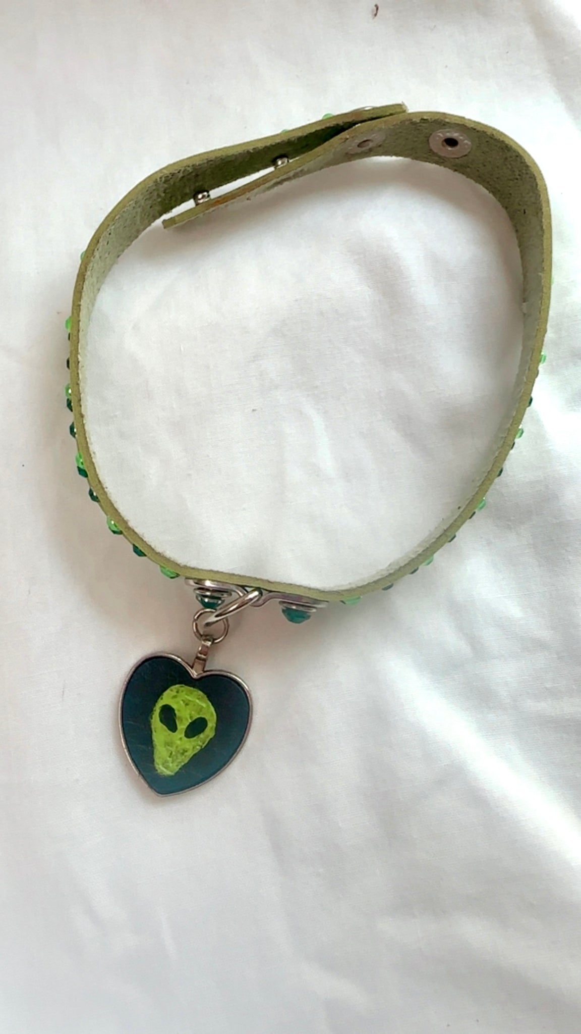 Lime green leather snap choker necklace with painted alien charm. Choker is rhinestoned