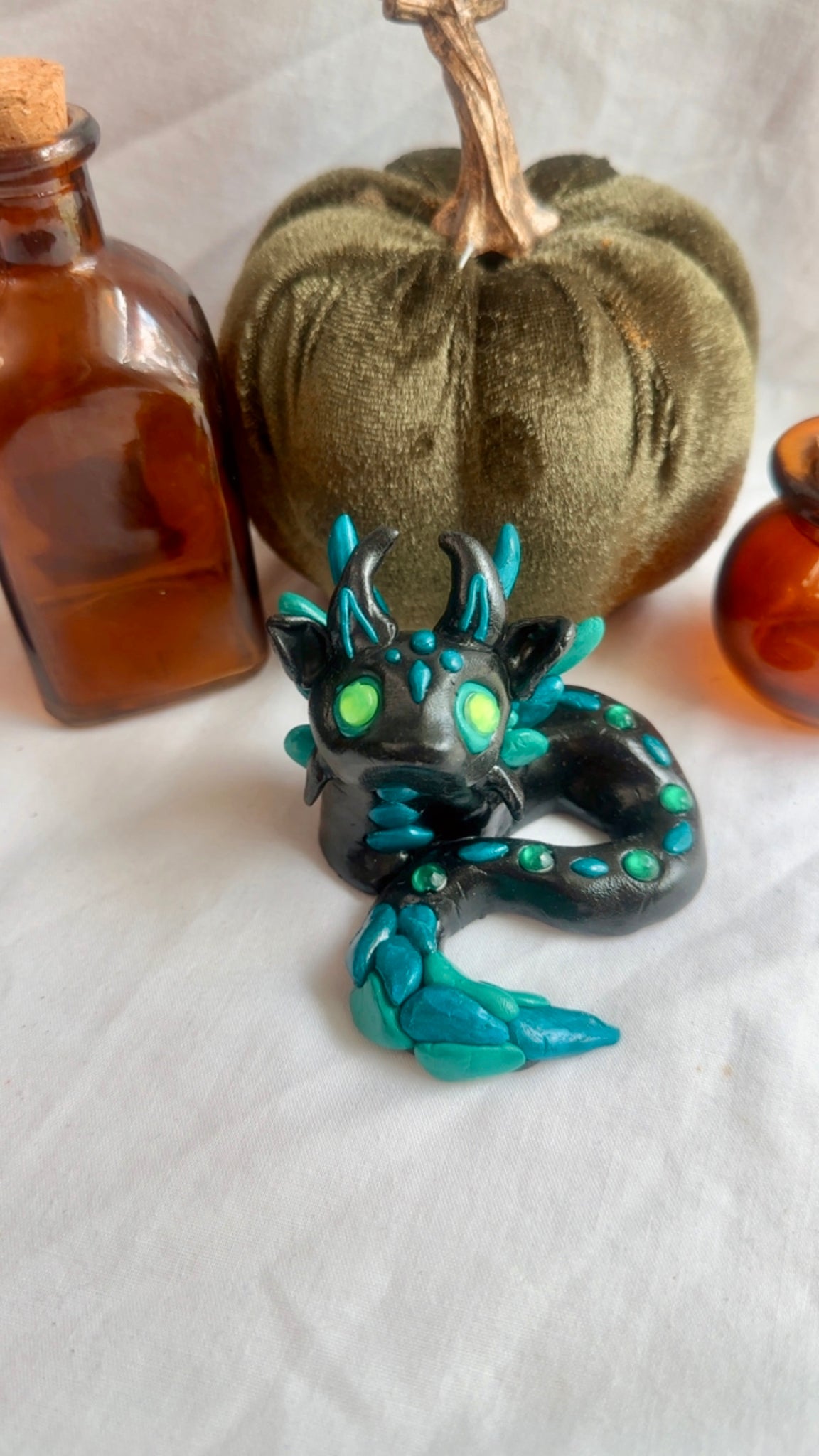 Polymer clay black and green dragon with rhinestone eyes figurine