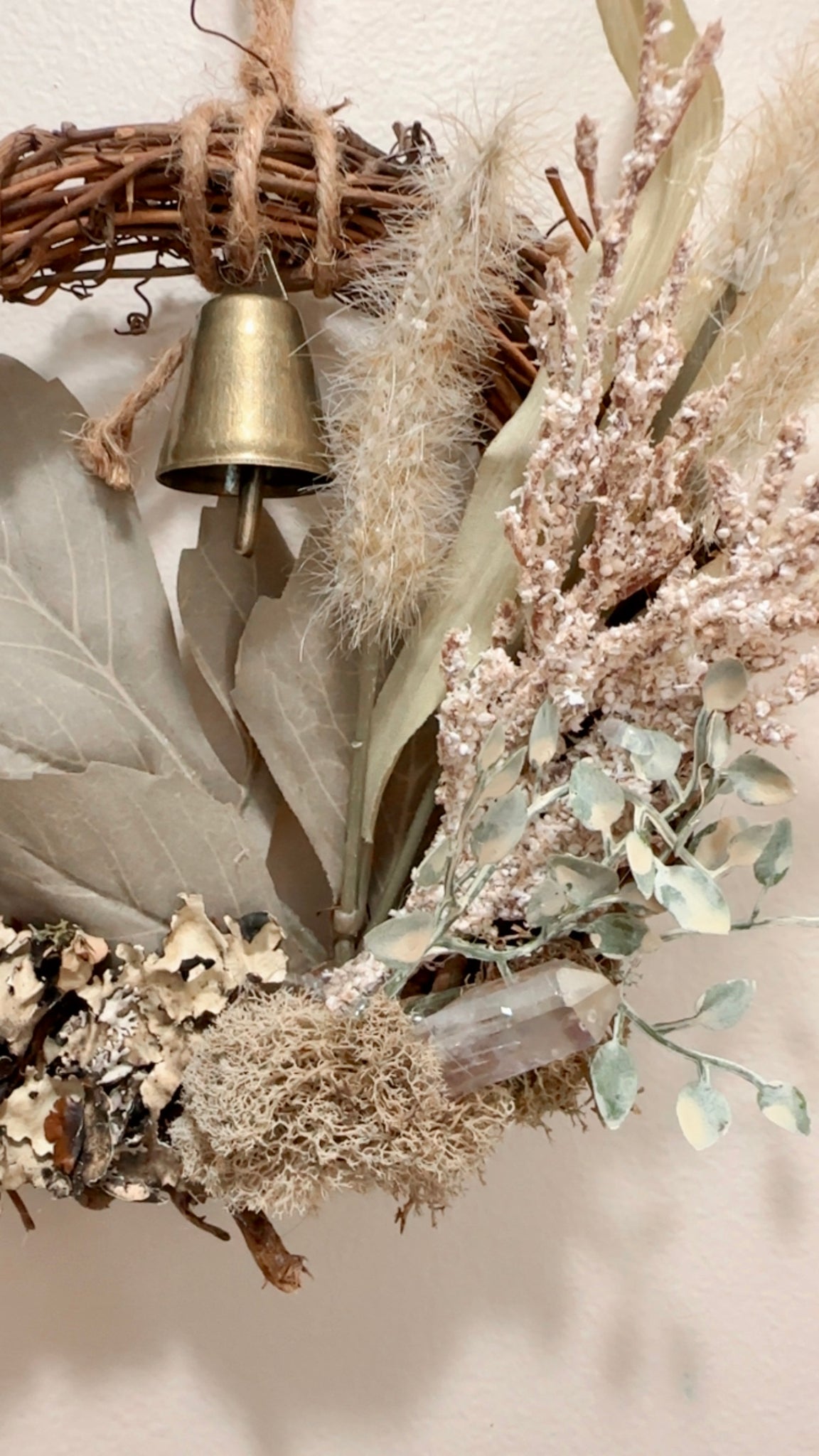 Small hanging autumn inspired wreath decorated with foliage, moss, quartz, a bell and a polymer clay gold moon