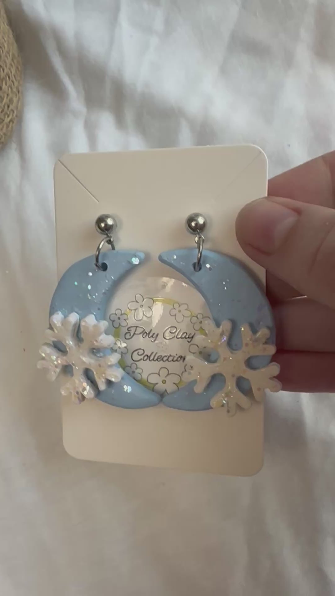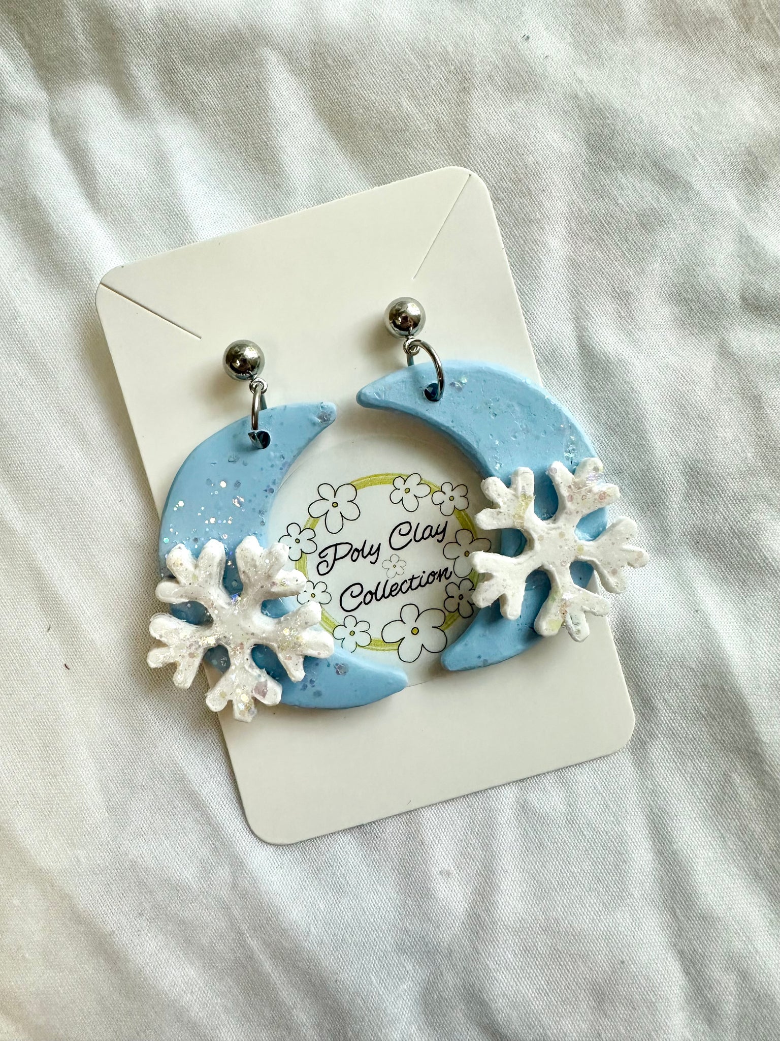 Polymer clay moon shaped ball post earrings with snowflake. Sparkly accent on top. Hypoallergenic posts.