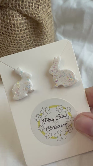 White polymer clay rabbit shaped stud earrings with sparkling white accent. Studs are stainless steel/ no tarnish